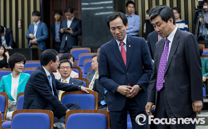 (서울=포커스뉴스) 19일 오전 여의도 국회에서 열린 더불어민주당 의원총회에 우상호 신임 원내대표와 이종걸 전 원내대표가 참석하고 있다.