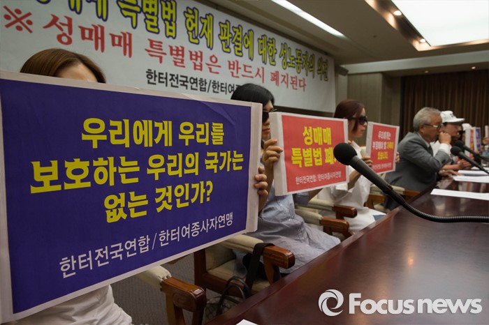 (서울=포커스뉴스) 19일 오전 서울 종로구 프레스센터에서 열린 '성매매 특별법 헌재 판결에 대한 성 노동자 기자회견'에 참석한 성 노동자들이 헌재 판결에 대한 반대를 표하는 손펫말을 들고 있다.