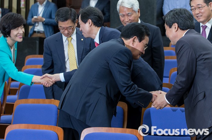 (서울=포커스뉴스) 19일 오전 여의도 국회에서 열린 더불어민주당 의원총회에 참석한 우상호 신임 원내대표와 이종걸 전 원내대표가 동료 의원들과 인사하고 있다.