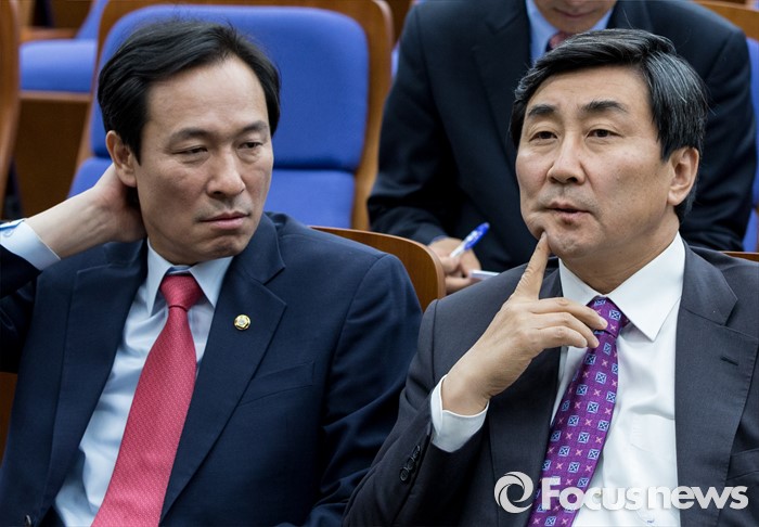 (서울=포커스뉴스) 19일 오전 여의도 국회에서 열린 더불어민주당 의원총회에 참석한 우상호 신임 원내대표와 이종걸 전 원내대표가 생각에 잠겨 있다.