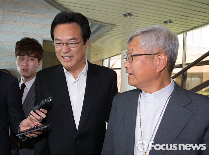 (대전=포커스뉴스) 정진석 새누리당 원내대표가 19일 오전 대전 동구 천주교 대전교구청을 찾아 유흥식 주교와 면담을 갖고 교구를 나서고 있다.