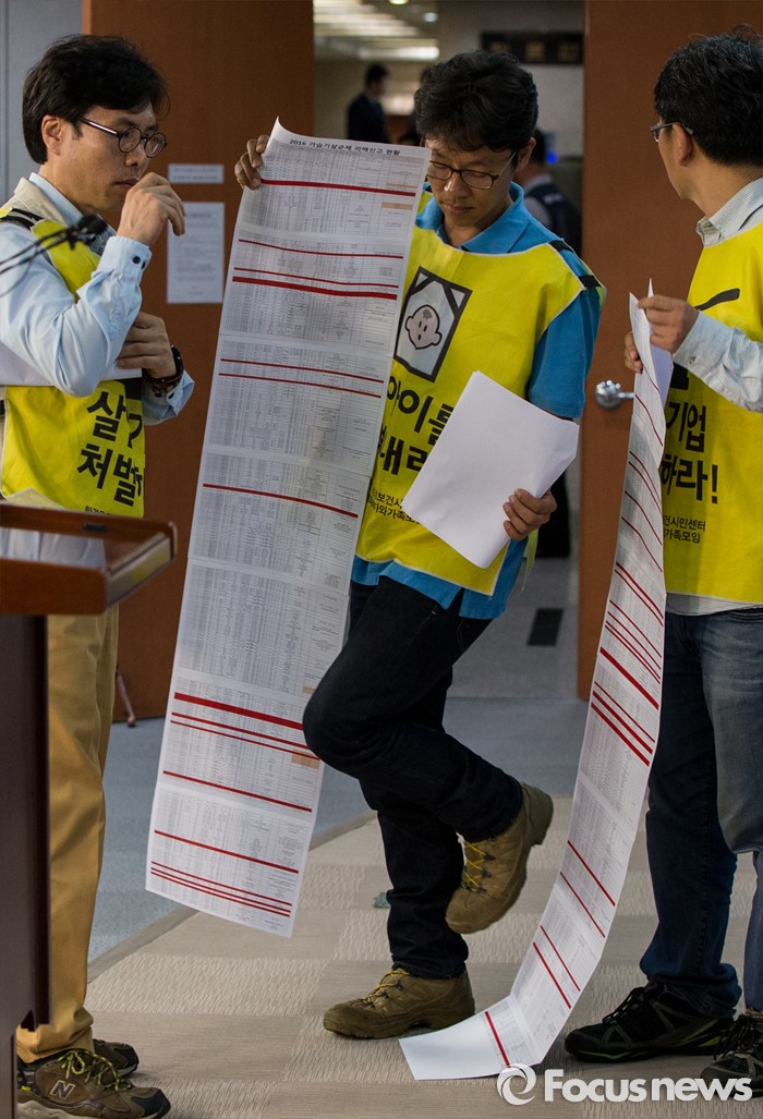 (서울=포커스뉴스) 19일 오전 여의도 국회 정론관에서 열린 '가습기살균제 피해 접수 결과 보고' 관련 기자회견에 참석한 가습기살균제 피해자 가족 안성우(가운데)씨와 강찬호 가습기 살균제 피해자 대책위 대표가 피해 신고 현황이 기록된 종이를 들고 있다.