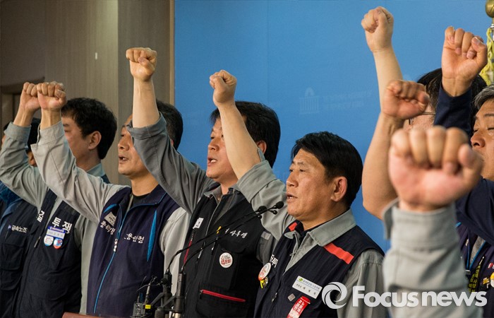 (서울=포커스뉴스) 19일 오전 여의도 국회 정론관에서 열린 '조선산업 발전과 구조조정에 관한 조선업종노조연대 대표자' 기자회견에 참석한 대표자들이 구호를 외치고있다.