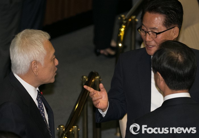 (서울=포커스뉴스) 19일 오전 서울 여의도 국회에서 열린 342회 국회(임시회) 1차 본회의에 참석한 천정배(오른쪽부터) 국민의당 공동대표, 박지원 원내대표, 김한길 의원이 대화하고 있다.