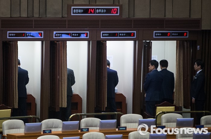 (서울=포커스뉴스) 19대 국회 의원들이 19일 오전 서울 여의도 국회에서 열린 342회 국회(임시회) 1차 본회의에서 무기명 투표를 하고 있다.