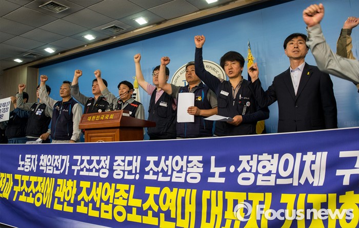 (서울=포커스뉴스) 19일 오전 여의도 국회 정론관에서 열린 '조선산업 발전과 구조조정에 관한 조선업종노조연대 대표자' 기자회견에 참석한 대표자들이 구호를 외치고있다.