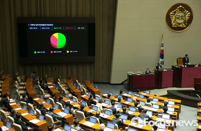 (서울=포커스뉴스) 19일 오전 서울 여의도 국회에서 열린 342회 국회(임시회) 1차 본회의에서 국회법 일부개정법률안(위원회안)이 재석 222인 중 찬성 117인, 반대 79인, 기권 26인으로 통과되고 있다.