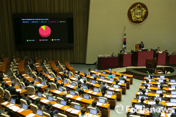 (서울=포커스뉴스) 19일 오전 서울 여의도 국회에서 열린 342회 국회(임시회) 1차 본회의에서 국회법 일부개정법률안에 대한 수정안(조원진 의원 등 30인 발의)이 재석 213인 중 찬성 7인, 반대 183인, 기권 23인으로 부결되고 있다.