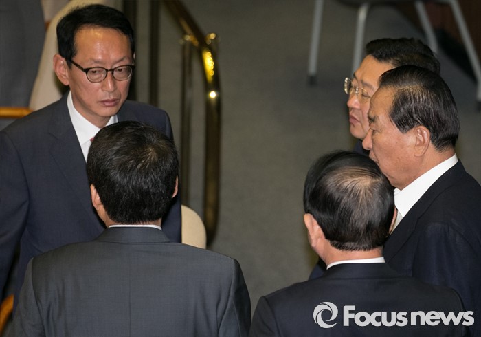 (서울=포커스뉴스) 19일 오전 서울 여의도 국회에서 열린 342회 국회(임시회) 1차 본회의에 참석한 김도읍 새누리당 원내수석부대표와 서청원 최고위원 등이 대화하고 있다.