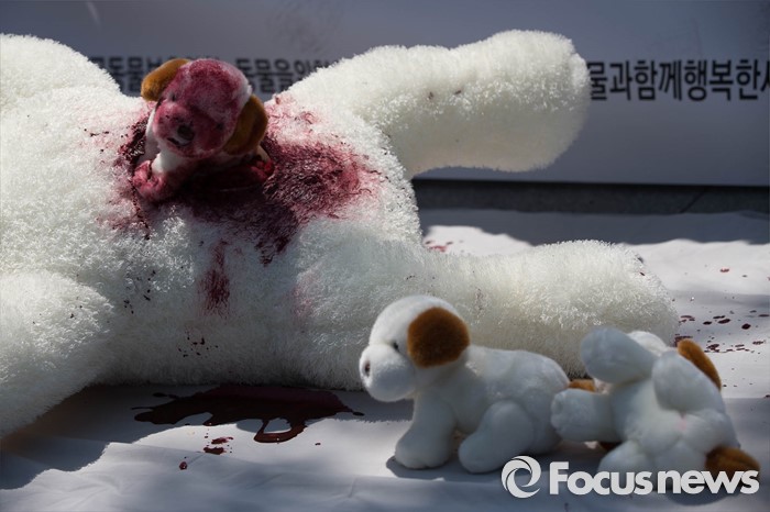 (서울=포커스뉴스) 19일 오후 서울 종로구 정부서울청사앞에서 동물자유연대 및 시민단체들이 강아지 공장 문제 해결을 촉구하며 퍼포먼스를 하고 있다.