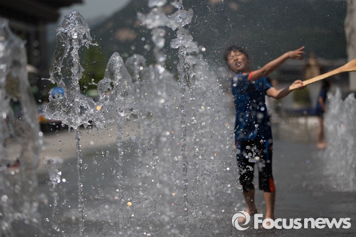 (서울=포커스뉴스) 서울의 낮 기온이 30도를 넘는 19일 오후 서울 광화문광장 분수대에서 아이들이 물놀이를 즐기고 있다.