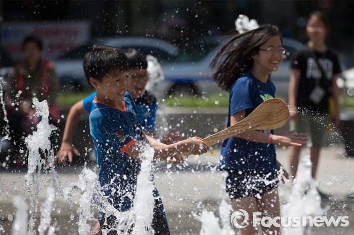 (서울=포커스뉴스) 서울의 낮 기온이 30도를 넘는 19일 오후 서울 광화문광장 분수대에서 아이들이 물놀이를 즐기고 있다.