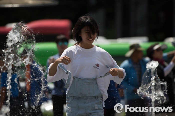 (서울=포커스뉴스) 서울의 낮 기온이 30도를 넘는 19일 오후 서울 광화문광장 분수대에서 아이들이 물놀이를 즐기고 있다.
