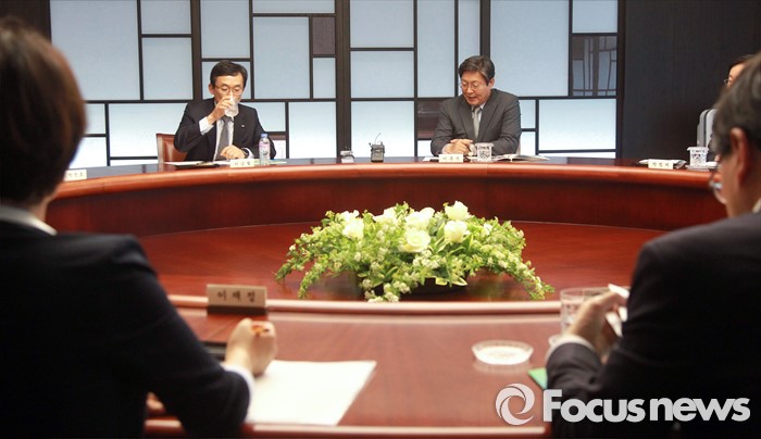 (서울=포커스뉴스) 현장조사에 나선 이춘석(오른쪽) 더불어민주당 어버이연합 등 불법 자금 지원 의혹 규명 진상조사 태스크포스(TF) 위원장이 19일 오후 서울 여의도 전국경제인연합회관에서 이승철 상근부회장 등과 간담회를 하고 있다.