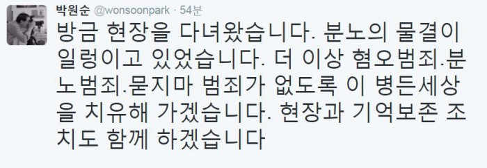 박 시장은 이날 자신의 사회관계망서비스(SNS) 트위터에 현장 방문 소식을 전하며 "분노의 물결이 일렁이고 있다"고 밝혔다.