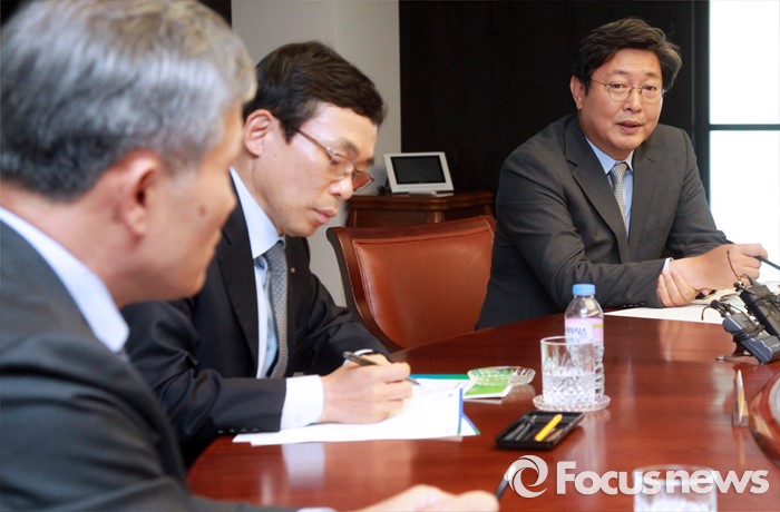 (서울=포커스뉴스) 현장조사에 나선 이춘석(오른쪽) 더불어민주당 어버이연합 등 불법 자금 지원 의혹 규명 진상조사 태스크포스(TF) 위원장이 19일 오후 서울 여의도 전국경제인연합회관에서 이승철(가운데) 상근부회장 등과 간담회를 하고 있다.