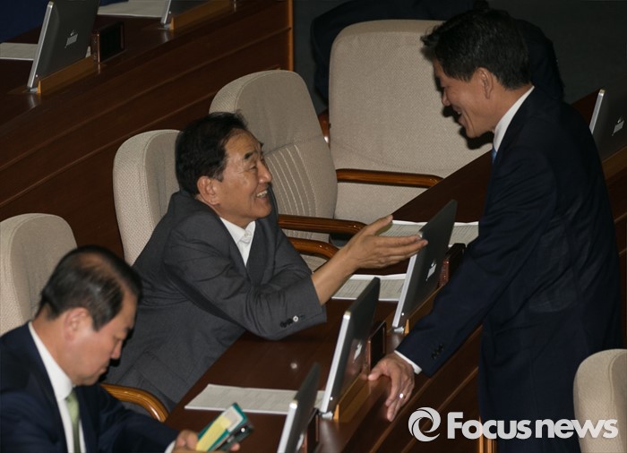 (서울=포커스뉴스) 19일 오후 서울 여의도 국회에서 열린 342회 국회(임시회) 1차 본회의에 참석한 주승용(오른쪽) 국민의당 전 원내대표와 이재오 무소속 의원이 대화하고 있다.
