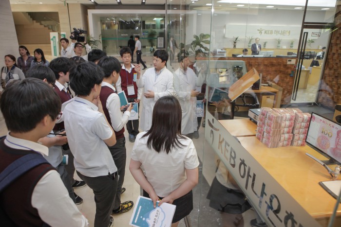 KEB하나은행은 18일 서울 을지로 본점에서 은행원 업무 소개와 외환 딜러, 위조지폐 감정전문가 체험 등 다채로운 프로그램을 담은 진로 선택 프로그램을 실시했다고 19일 밝혔다.