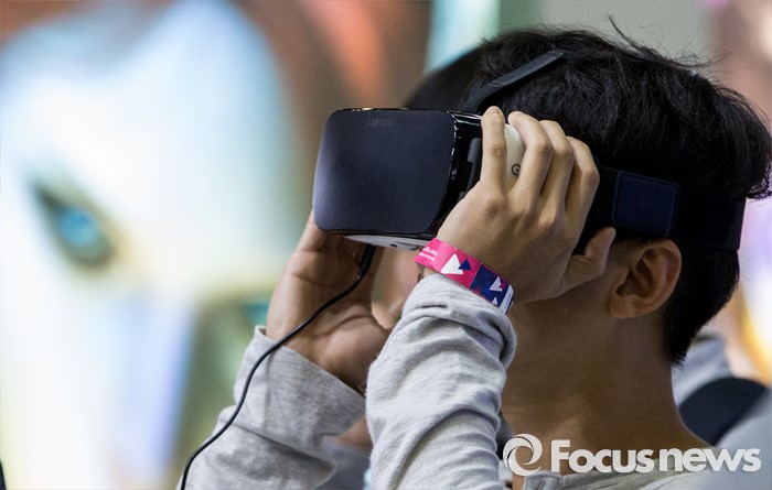 (고양=포커스뉴스) 19일 오후 경기 고양시 킨텍스 제1전시관에서 열린 2016 플레이엑스포를 찾은 관람객이 가상현실 게임을 즐기고 있다.