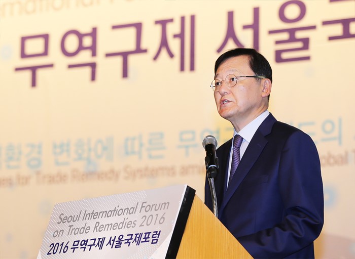 (서울=포커스뉴스) 이관섭 산업통상자원부 1차관이 19일 서울 대한상공회의소 국제회의장에서 홍순직 무역위원회 위원장과 해외 무역구제 기관 대표 및 국내외 무역 전문가 300여명이 참석한 가운데 세계무역환경 변화에 따른 무역구제제도의 새로운 과제란 주제로 열린 2016년 무역구제 서울국제포럼에 참석해 축사를 하고 있다. <사진제공=산업통상자원부>