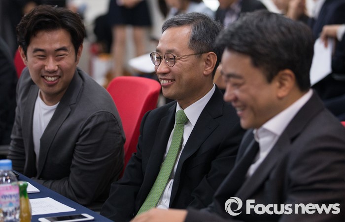 (서울=포커스뉴스)19일 오후 서울 강남구 위메프 본사에서 열린 '전자상거래 업계대표 간담회'에 참석한 업계대표들이 환한 웃음을 짓고 있다. 왼쪽부 임지훈 카카오 대표이사, 김상헌 네이버 대표이사 사장, 변광윤 이베이코리아 사장.