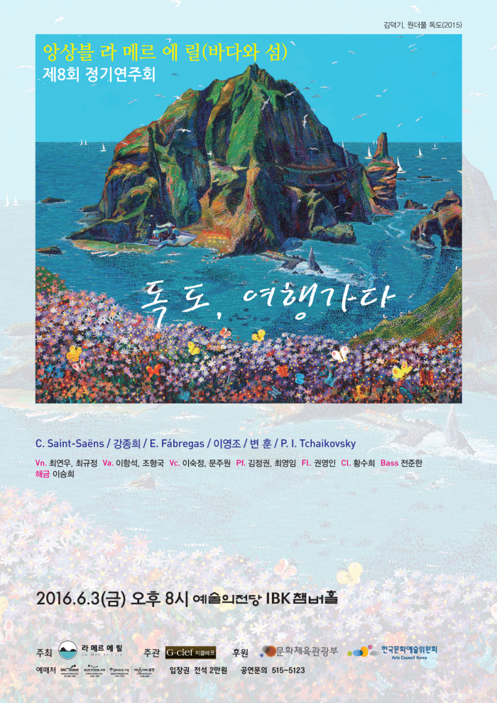 라 메르 에 릴 이함준 대표는 "예술가들이 음악, 미술, 시, 무용 등으로 동해와 독도를 노래하고 표현한다면 동해가 우리의 바다고 독도가 우리의 땅이라고 강조할 필요도 없을 것이다. 예술을 통해 동해와 독도가 우리 생활 속에 숨쉬는 우리의 바다와 섬으로 승화되는 것이다"라고 의미를 설명했다.문화예술인들의 모임 앙상블 '라 메르 에 릴'이 제8회 정기연주회 '독도, 여행가다'를 다음달 3일 오후 8시 서울 서초구 예술의전당 IBK챔버홀에서 연다. 사진은 정기연주회 포스터. <사진제공=라 메르 에 릴>
