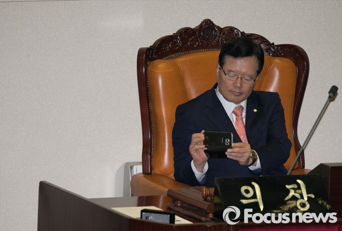 아울러 "이제 저는 국회를 떠나지만 20대 국회에 들어오실 분들은 국민의 목소리를 폭넓게 수용해야 한다"고 덧붙였다.19일 오전 서울 여의도 국회에서 열린 342회 국회(임시회) 1차 본회의에 참석한 정의화 국회의장이 핸드폰으로 사진촬영을 하고 있다. 2016.05.19 박동욱 기자