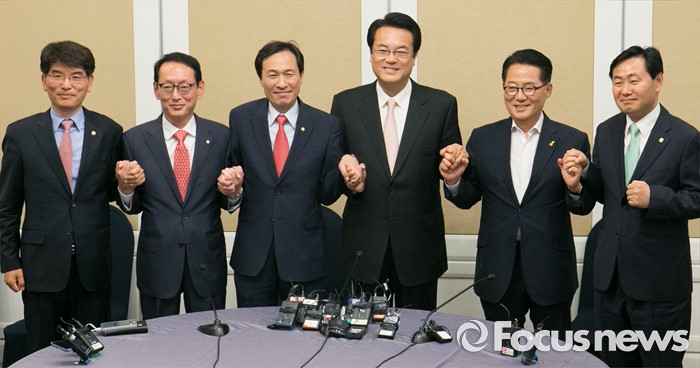 (서울=포커스뉴스) 19일 오후 서울 여의도 국회 귀빈식당에서 20대 국회 원구성 등 협상을 위해 열린 3당 원내대표 회동에 참석한 의원들이 포즈를 취하고 있다. 왼쪽부터 우상호 더불어민주당 원내대표, 정진석 새누리당 원내대표, 박지원 국민의당 원내대표.