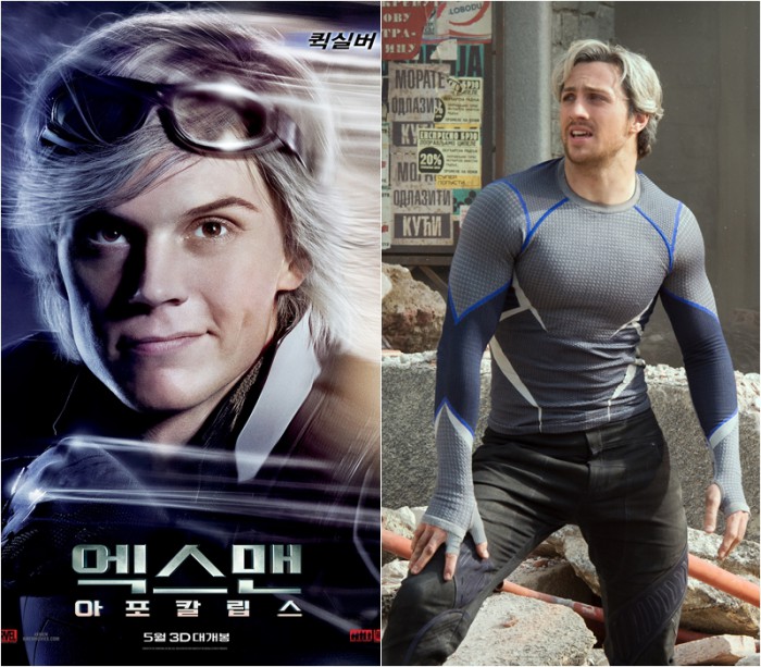 초음속으로 움직이는 초능력 캐릭터 퀵실버는 영화 '엑스맨: 아포칼립스'와 영화 '어벤져스' 시리즈에 공통으로 등장한다. 같은 능력을 가졌지만 배우는 다르다. '엑스맨' 시리즈에서는 피터스가, '어벤져스' 시리즈에서는 애런 존슨이 각각 퀵실버를 연기했다.