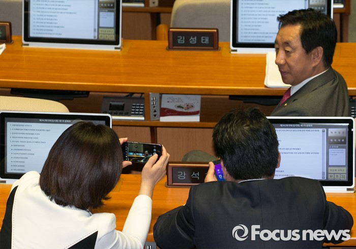 (서울=포커스뉴스) 19일 오후 서울 여의도 국회에서 열린 342회 국회(임시회) 1차 본회의에 참석한 의원들이 서로 촬영을 하고 있다.