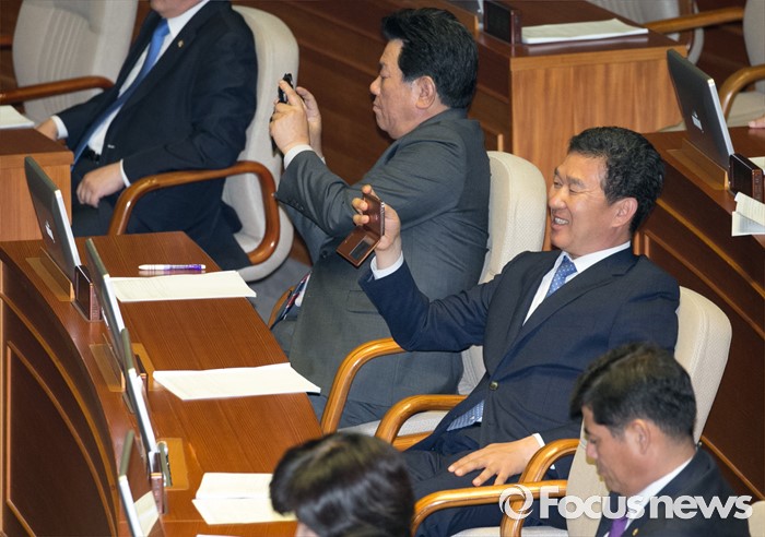 (서울=포커스뉴스) 19일 오후 서울 여의도 국회에서 열린 342회 국회(임시회) 1차 본회의에 참석한 의원들이 정의화 국회의장의 마무리 발언 모습 등을 촬영하고 있다.
