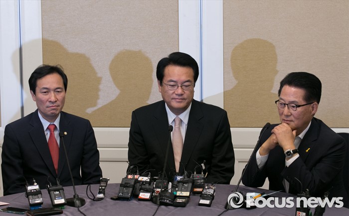 (서울=포커스뉴스) 19일 오후 서울 여의도 국회 귀빈식당에서 20대 국회 원구성 등 협상을 위해 열린 3당 원내대표 회동에 참석한 정진석(가운데) 새누리당 원내대표, 우상호(왼쪽) 더불어민주당 원내대표, 박지원 국민의당 원내대표가 생각에 잠겨 있다.