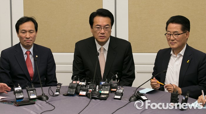 (서울=포커스뉴스) 19일 오후 서울 여의도 국회 귀빈식당에서 20대 국회 원구성 등 협상을 위해 열린 3당 원내대표 회동에 참석한 정진석 새누리당 원내대표가 모두발언을 하고 있다. 왼쪽부터 우상호 더불어민주당 원내대표, 정 원내대표, 박지원 국민의당 원내대표.