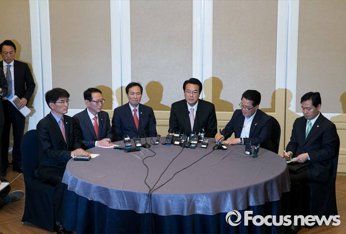(서울=포커스뉴스) 19일 오후 서울 여의도 국회 귀빈식당에서 20대 국회 원구성 등 협상을 위해 열린 3당 원내대표 회동에 참석한 정진석 새누리당 원내대표가 모두발언을 하고 있다. 왼쪽부터 박완주 더불어민주당 원내수석부대표, 김도읍 새누리당 원내수석부대표, 우상호 더불어민주당 원내대표, 정진석 새누리당 원내대표, 박지원 국민의당 원내대표, 김관영 원내수석부대표.