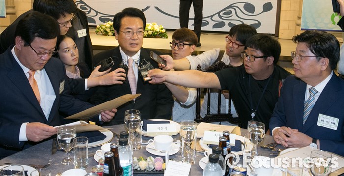(서울=포커스뉴스) 19일 오후 여의도 서울시티클럽에서 열린 충청 향우 친선의 밤 행사에 참석한 정진석 새누리당 원내대표가 취재진 질문을 받고 있다. 오른쪽부터 권선택 대전시장, 정 원내대표, 이은권 새누리당 당선인.