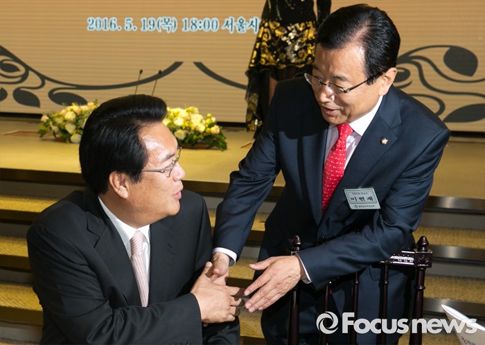 (서울=포커스뉴스) 19일 오후 여의도 서울시티클럽에서 열린 충청 향우 친선의 밤 행사에 참석한 정진석(왼쪽) 새누리당 원내대표와 이현재 의원이 인사하고 있다.