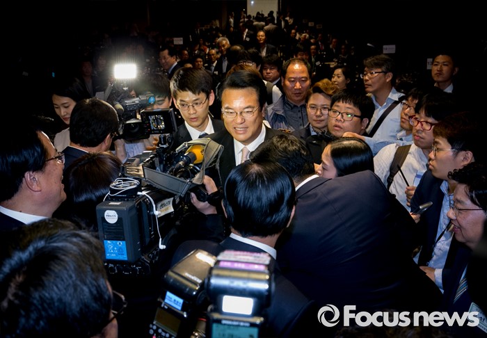 (서울=포커스뉴스) 19일 오후 여의도 서울시티클럽에서 열린 충청 향우 친선의 밤 행사에 참석한 정진석 새누리당 원내대표가 취재진 질문을 받으며 이동하고 있다.