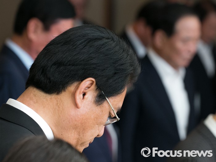 (서울=포커스뉴스) 19일 오후 여의도 서울시티클럽에서 열린 충청 향우 친선의 밤 행사에 참석한 정진석(왼쪽) 새누리당 원내대표와 서청원 전 최고위원이 묵념을 하고 있다.