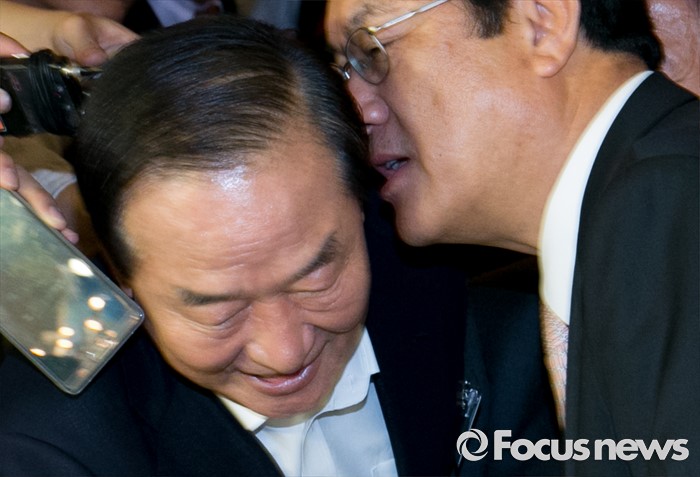 (서울=포커스뉴스) 19일 오후 여의도 서울시티클럽에서 열린 충청 향우 친선의 밤 행사에 참석한 정진석(오른쪽) 새누리당 원내대표와 서청원 전 최고위원이 대화하고 있다.