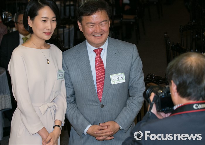 (서울=포커스뉴스) 19일 오후 여의도 서울시티클럽에서 열린 충청 향우 친선의 밤 행사에 참석한 민경욱(오른쪽) 새누리당 원내대변인과 김수민 국민의당 당선인이 기념촬영을 하고 있다.