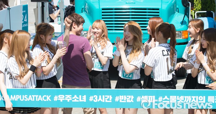 (서울=포커스뉴스) 19일 오후 서울 종로구 성균관대 캠퍼스에서 걸그룹 우주소녀의 멤버들이 'Y24 스쿨어택' 행사에 참여해 한 팬과 인사를 하고 있다.