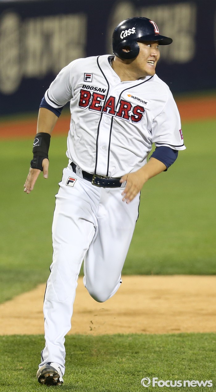 (서울=포커스뉴스) 19일 서울 잠실구장에서 열린 2016프로야구 KIA-두산 경기 4회말 1사후 좌중간 안타로 진루한 두산 오재일이 양의지의 우중간 2루타때 전력질주해 홈인하고 있다.