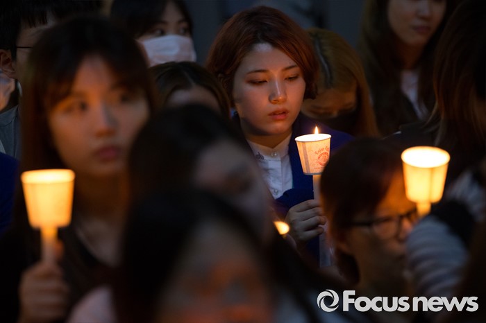(서울=포커스뉴스) 19일 오후 서울 서초구 강남역 10번출구에서 시민들이 '강남 묻지마 살인' 피해자를 추모하는 촛불문화제를 하고 있다.