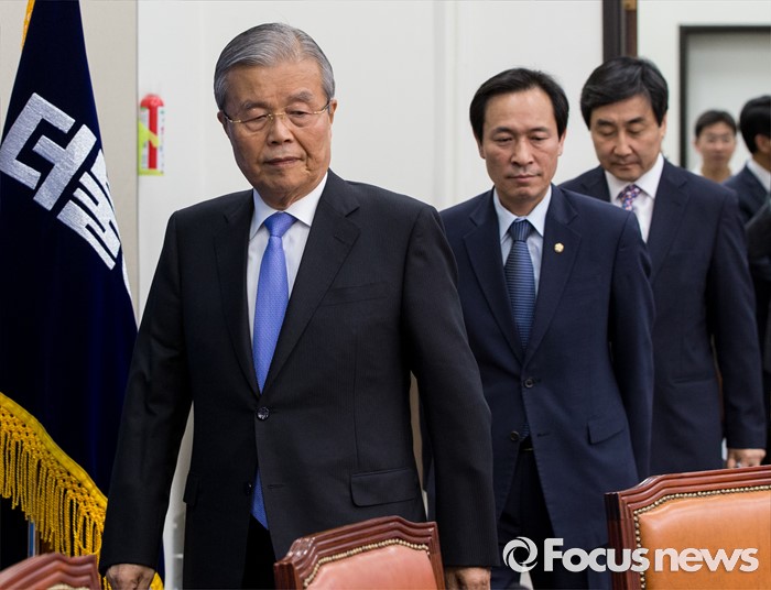 (서울=포커스뉴스) 20일 오전 서울 여의도 국회에서 열린 더불어민주당 비상대책위원회의에 김종인(왼쪽부터) 비대위 대표와 우상호 원내대표, 이종걸 전 원내대표가 참석하고 있다.