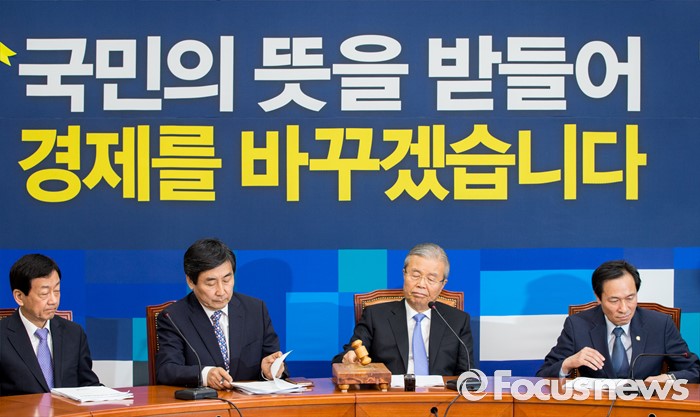 (서울=포커스뉴스) 20일 오전 서울 여의도 국회에서 열린 더불어민주당 비상대책위원회의에 참석한 김종인 비대위 대표가 폐회를 선언하는 의사봉을 두드리고 있다.