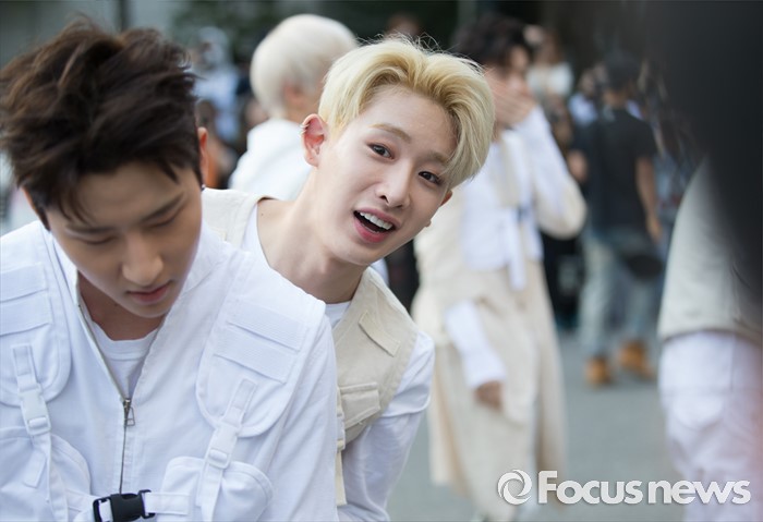 (서울=포커스뉴스) 20일 오전 서울 영등포구 KBS에서 아이돌그룹 몬스타엑스의 멤버들이 생방송 뮤직뱅크 리허설에 참여하기 위해 이동하던 중 인터뷰를 하고 있다.