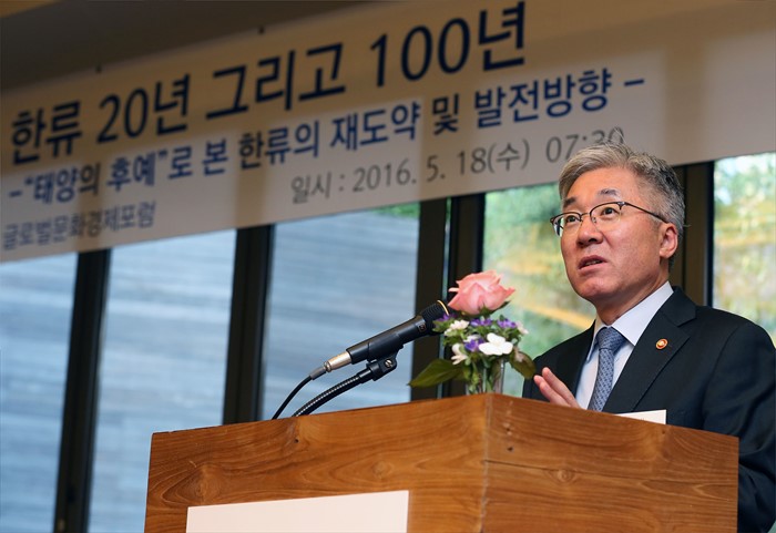 김종덕 문체부 장관은 "문화가 있는 날 사업 시행 3년 차에 이번 '문화기본법' 개정안이 국회를 통과함으로써 법적 기반이 마련되어 대단히 기쁘다"며 "문화가 있는 날을 대한민국 명품 문화정책으로 본격적으로 육성하기 위해 관련 부처와 지자체 등 모든 행정력을 동원하겠다"라고 소감을 밝혔다.지난 18일 서울 여의도 대신증권에서 열린 '글로벌문화경제포럼'에 참석한 김종덕 문체부 장관이'태양의 후예로 본 한류 재도약 및 향후 발전방향'이라는 제목으로 강연을 하고 있다.<사진제공=문화체육관광부>