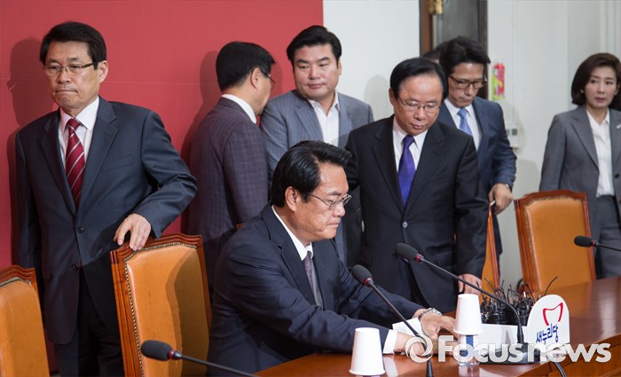 (서울=포커스뉴스) 정진석(앞 앉은 사람) 새누리당 원내대표와 중진의원들이 20일 오전 서울 여의도 국회에서 열린 원내지도부-중진의원 연석회의에 참석하고 있다. 뒷줄 왼쪽부터 이군현, 홍문종, 원유철, 이주영, 정병국, 나경원 의원.