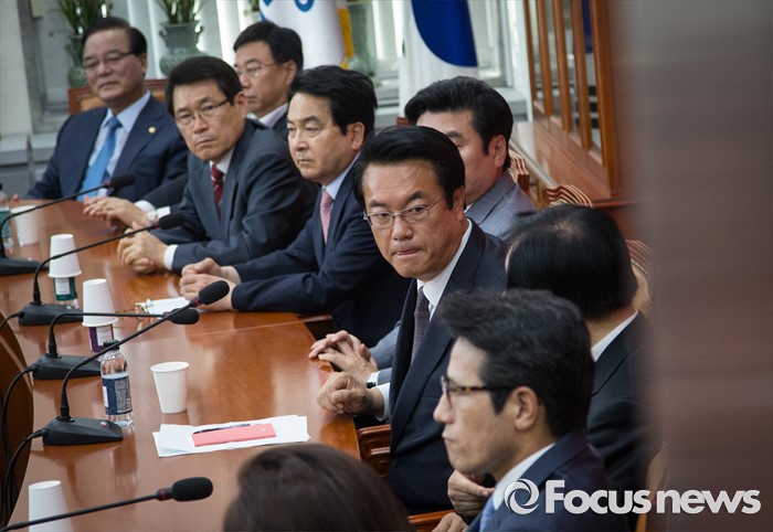 (서울=포커스뉴스) 정진석(오른쪽 세번째) 새누리당 원내대표와 중진의원들이 20일 오전 서울 여의도 국회에서 열린 원내지도부-중진의원 연석회의에 참석해 논의하고 있다.