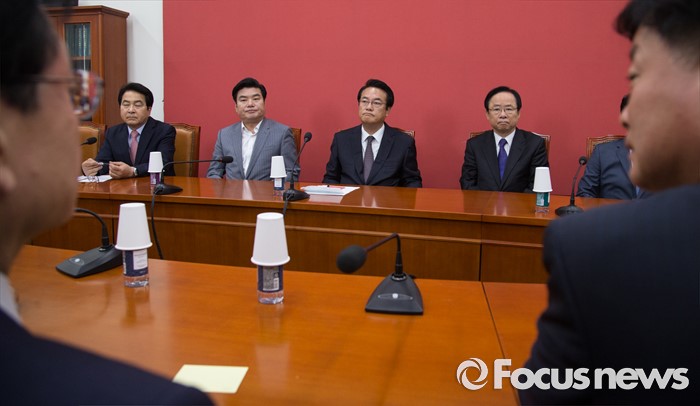 (서울=포커스뉴스) 정진석 새누리당 원내대표와 원유철 전 원내대표를 비롯한 중진의원들이 20일 오전 서울 여의도 국회에서 열린 원내지도부-중진의원 연석회의에 참석해 자리하고 있다. 왼쪽부터 심재철, 원유철 의원, 정 원내대표, 이주영 의원.